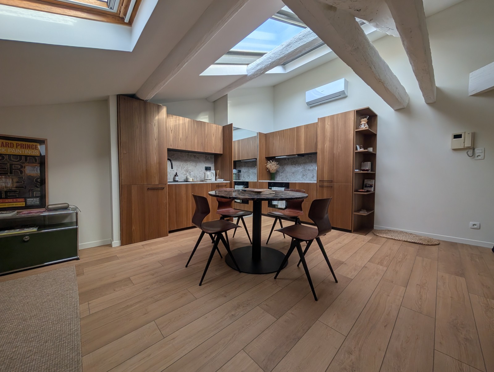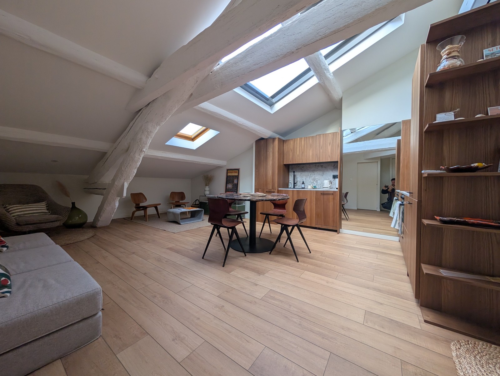 L’appartement présente de beaux volumes avec une hauteur sous plafond généreuse, des poutres apparentes et une luminosité naturelle apportée par des fenêtres de toit.