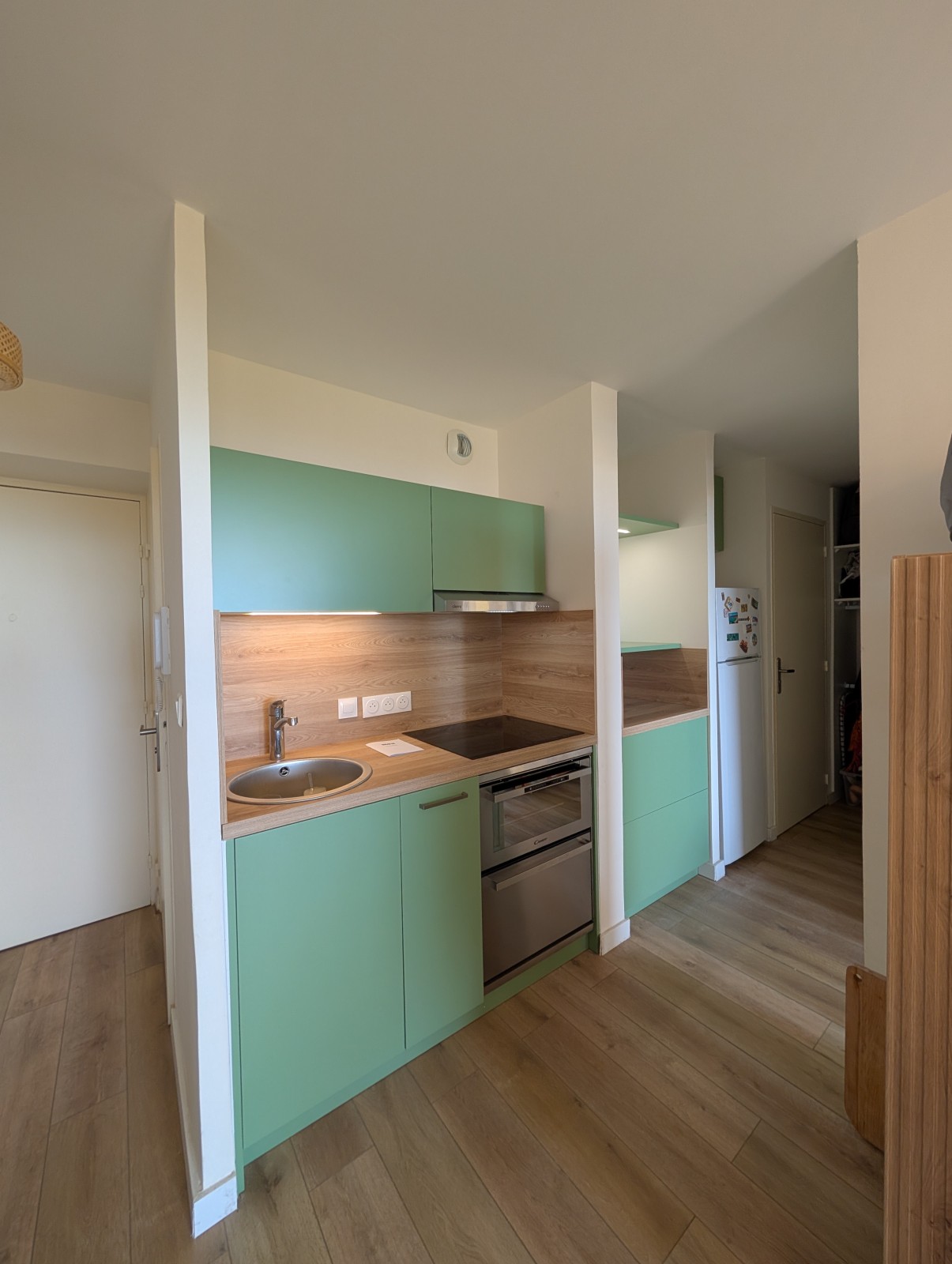Cette combinaison crée une cuisine lumineuse et agréable, parfaitement intégrée à l’univers de l’appartement.