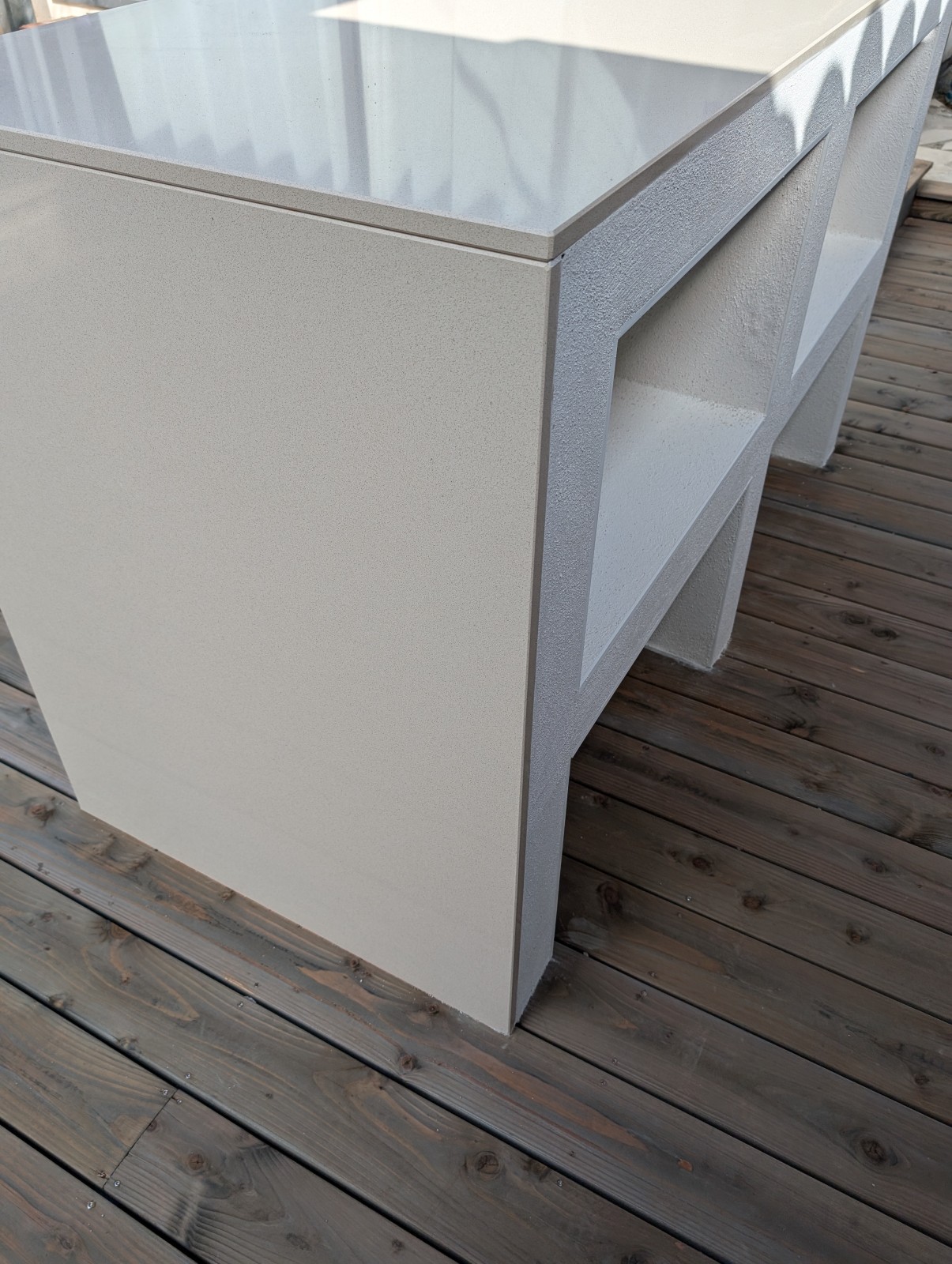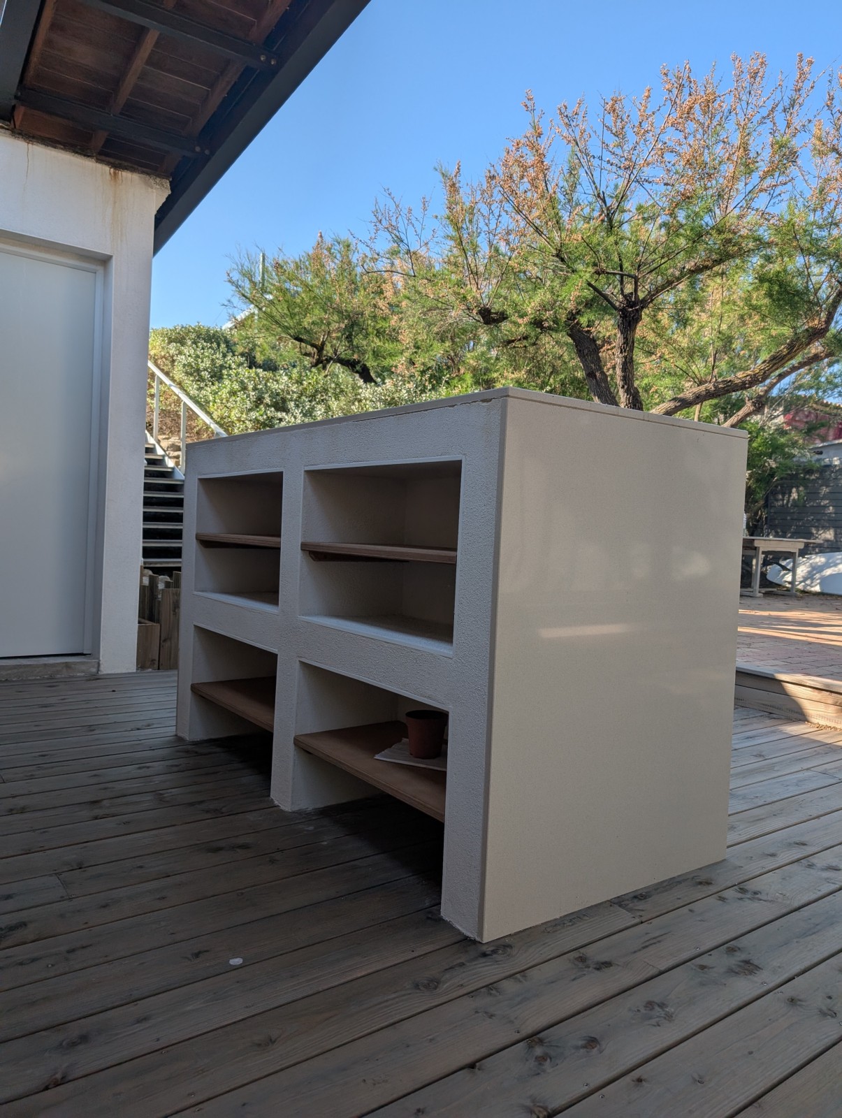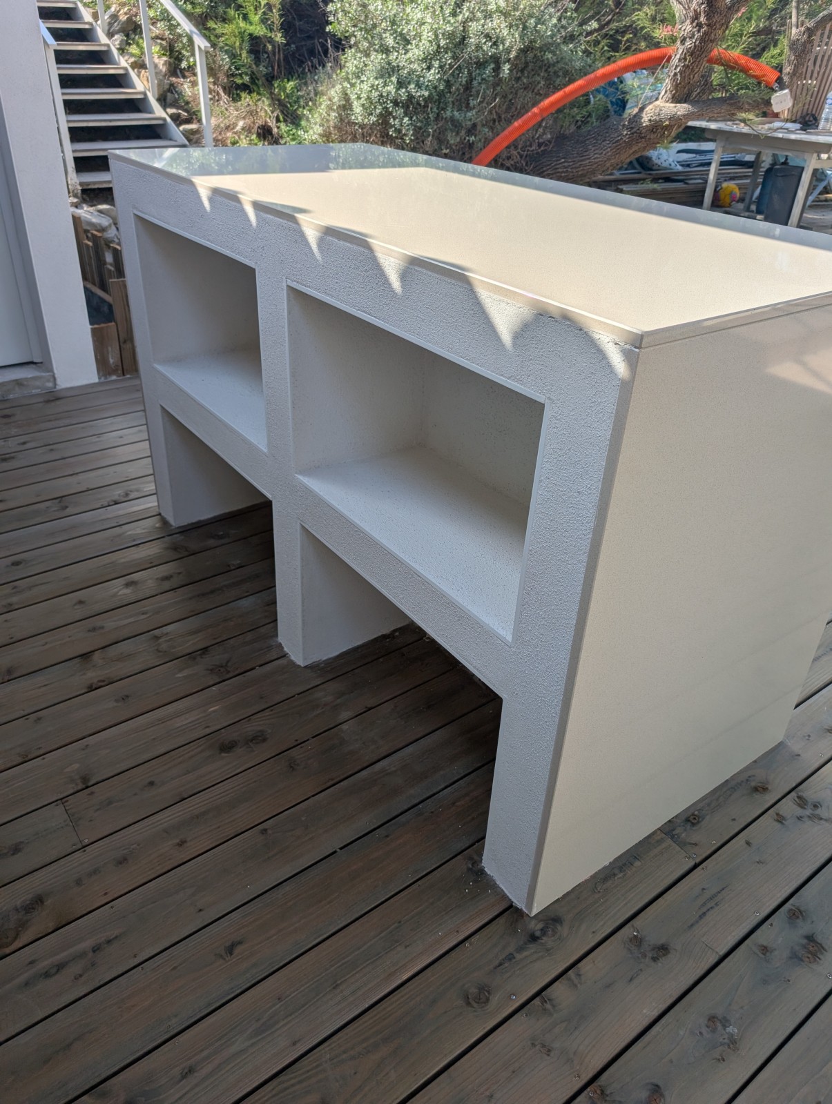 Le cœur de cette cuisine extérieure est un îlot central sur-mesure, idéal pour les apéritifs, barbecues et soirées conviviales. Conçu pour favoriser le partage, il transforme l’espace en point central de vie extérieure, parfait pour profiter de l’été à Sète et ses environs.